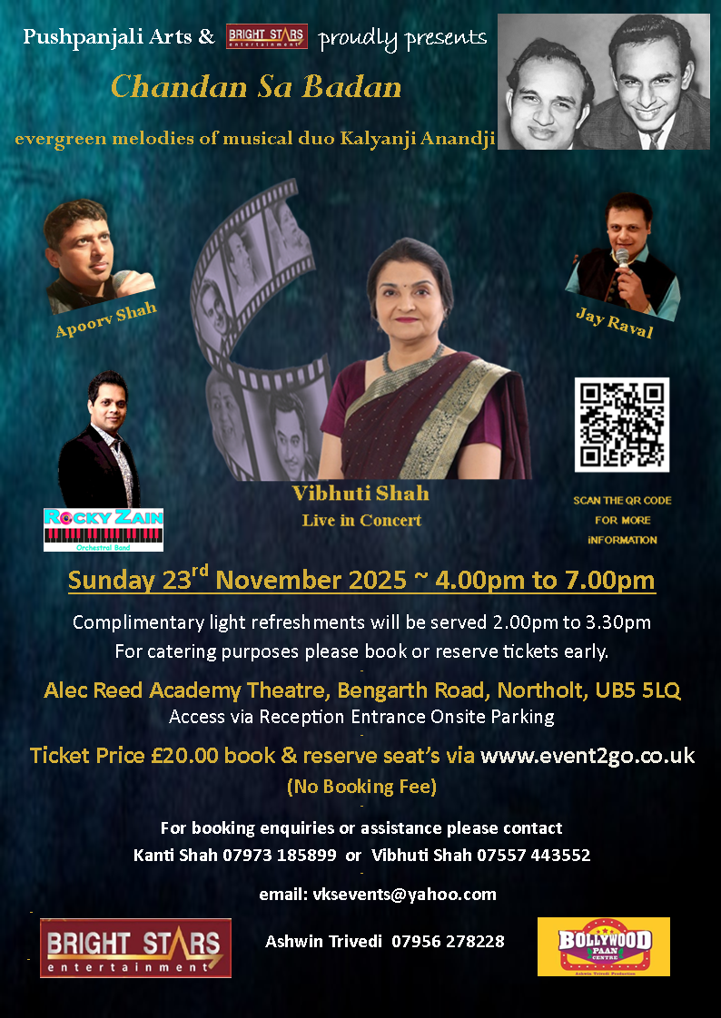 Pushpanjali Arts & Bright Stars Entertainment are proud to present Chandan sa Badan, a concert of some of the most evergreen & popular melodies of the musical duo Kalyanji-Anandjibhai. The theme & concept conceived with a carefully selected versatile repertoire of songs by Vibhuti Shah.
